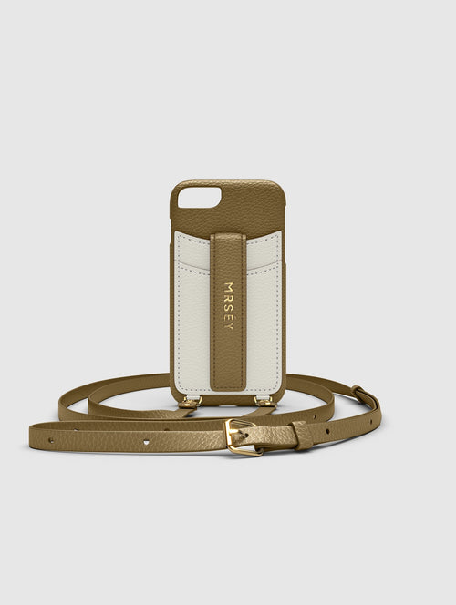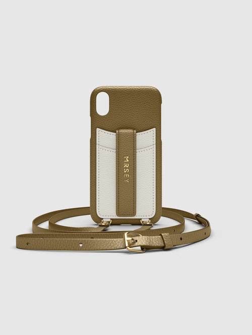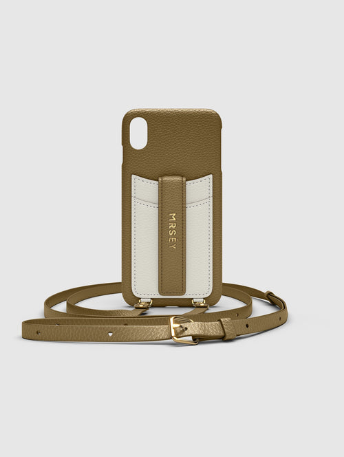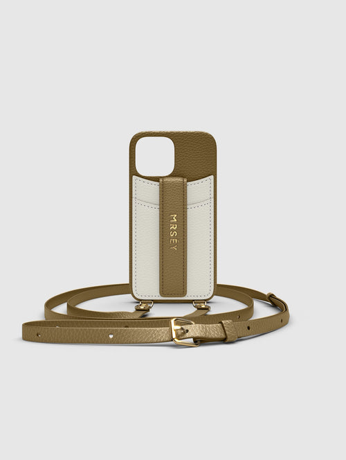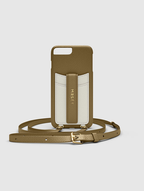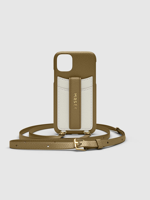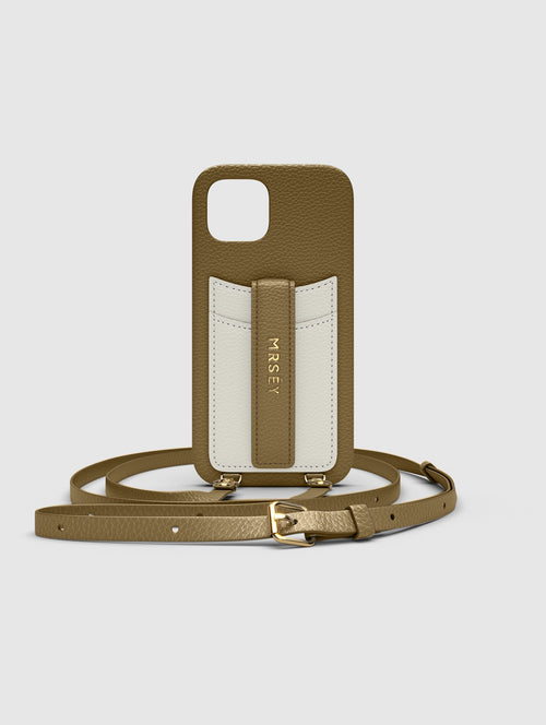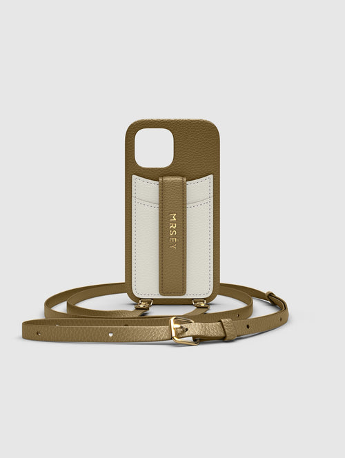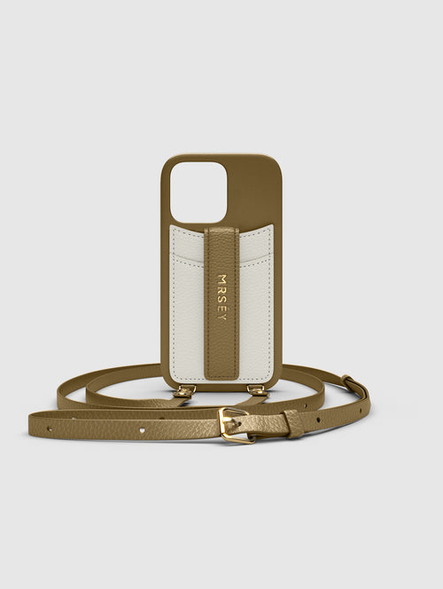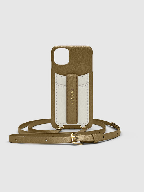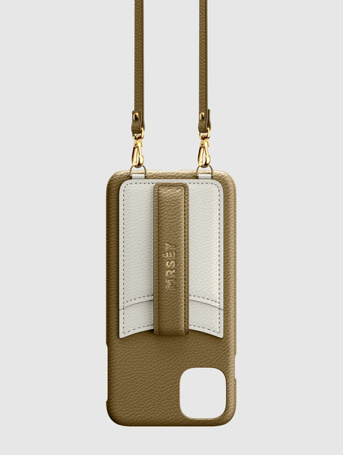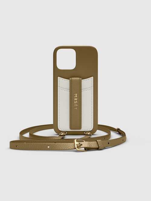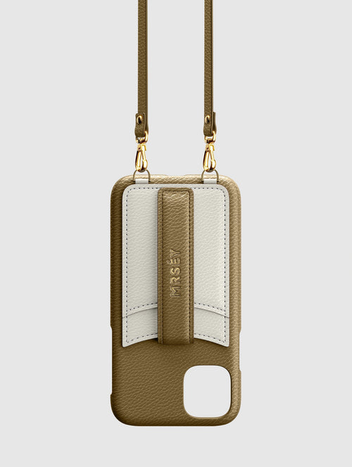 Mit dem MRSÉY Crossbody Phone Case bleibt das iPhone stets griffbereit. Es wird als Kette um Hals oder Schultern getragen. Die elegante Hülle aus veganem Leder bietet zwei praktische Fächer für Kreditkarte oder Ausweis. inklusive Tragegurt.