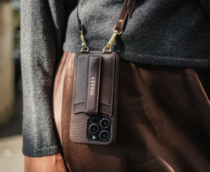 Keep your iPhone within reach with MRSÉYs elegant iPhone Case crafted from vegan PU leather. Can be worn across your body or around your neck. Two compartments with a handy pull-out tab perfect for your credit cards or ID. Includes strap.