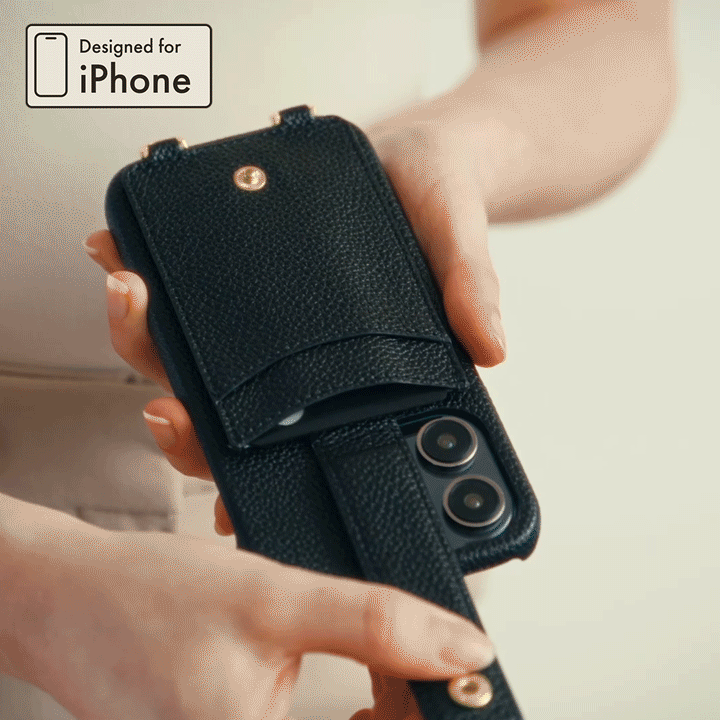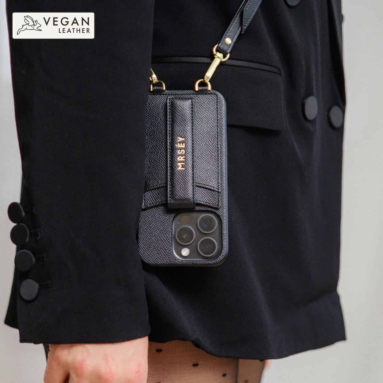 Mit dem MRSÉY Crossbody Phone Case bleibt das iPhone stets griffbereit. Es wird als Kette um Hals oder Schultern getragen. Die elegante Hülle aus veganem Leder bietet zwei praktische Fächer für Kreditkarte oder Ausweis. inklusive Tragegurt.